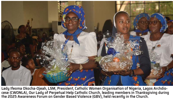 Nigerian women, Catholics in particular have been urged to always imitate the virtues of the blessed Virgin Mary, and ensure they speak up and help in tackling criminal acts, especially Gender Based Violence (GBV), a social problem and sin against human dignity. The charge was given by Mrs. Judith Bulama, Coordinator, Catholic Women Organisation of Nigeria, Lagos Archdiocese (CWONLA), Lekki Deanery and Guest Speaker at the Catholic Women Organisation of Nigeria (CWON), Our Lady of Perpetual Help Catholic Church, Victoria Island at an awareness forum on Gender Based Violence, held recently in the church premises. Speaking on the various forms, preventive measures and way forward, Mrs. Bulama said silence is not an option for GBV, adding that our faith as Christians, especially as Catholics, demands action, compassion, and responsibility.