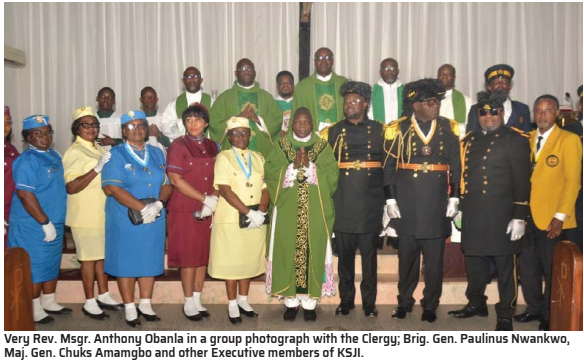 Presenting the new Executives for blessings, Major Gen. Joachim Chuks Amamgbo, the Supreme Subordinate President, expressed joy, as he disclosed that Very Rev. Fr. Michael Omoghele, KSJI National Chaplain; Lt. Gen. Patrick Igwilo, number three Knight in the world; himself (Amamgbo), number one Knight for brothers in Nigeria and Lady Nonye Okafor, number one Knight, Ladies Auxiliary in Nigeria are all from Lagos Archdiocese. He said: “So, what more can we ask of God that he has not done for us. For 30 years, Lagos has never taken the national presidency, now is our time and we have it double. We give God all the glory for it.”