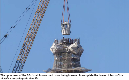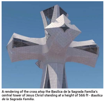 Almost a century and a half after construction began on La Sagrada Familia, the exterior structure of the tallest church in the world was finally completed last Friday in Barcelona, Spain. The Basílica i Temple Expiatori de la Sagrada Família, as it’s officially named and the only way I refer to it in casual conversation, has now had its tallest tower, the tower of Jesus Christ, reach its maximum height. It’s been topped with the upper arm of a three-dimensional four-armed cross that’s clad in glass and white enameled ceramic. Last week saw the upper arm of this roughly 56-ft (17-m) tall cross fitted with the help of a giant crane.